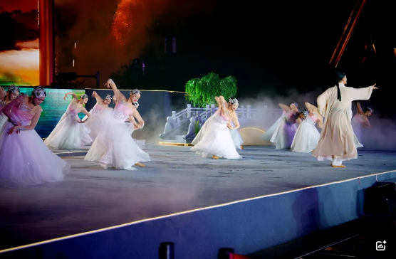 《煙雨橫江》將齊云山的美景盡收眼底。舞臺上,舞者們輕盈起舞,如同山間云霧,又似江面波光,將齊云山那份獨有的溫婉與壯麗展現(xiàn)得淋漓盡致。每一幕,都是一幅流動的山水畫,讓人沉醉不已。《逍遙齊云》則是一次文化的深度觸碰。徐霞客的探秘之旅、朱熹的哲理沉思、唐伯虎的浪漫情懷,三位歷史名人的詩歌在舞臺上生動再現(xiàn)。舞者們通過肢體語言,將文人墨客對齊云山的那份熱愛與向往,化作一曲曲動人的詩篇,引領(lǐng)觀眾步入一個充滿詩意與哲思的世界。