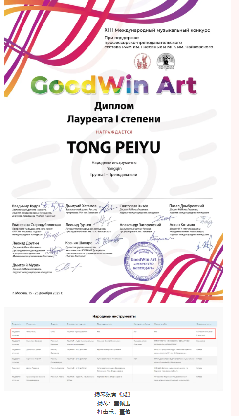 據(jù)了解,GoodWin Art是由古德溫藝術協(xié)會與弗拉基米爾·庫德里創(chuàng)意中心聯(lián)合主辦,并得到俄羅斯聯(lián)邦文化部大力支持的國際藝術比賽。比賽旨在為全球音樂院校師生、職業(yè)音樂家及青少年藝術教育從業(yè)者提供一個展示才華的舞臺,讓音樂跨越國界,綻放無限魅力。評審團陣容強大,由俄羅斯榮譽藝術家、人民藝術家,以及格涅辛音樂學院和莫斯科柴可夫斯基國立音樂學院的教授、副教授和教師共同組成。(安徽樂團供稿)