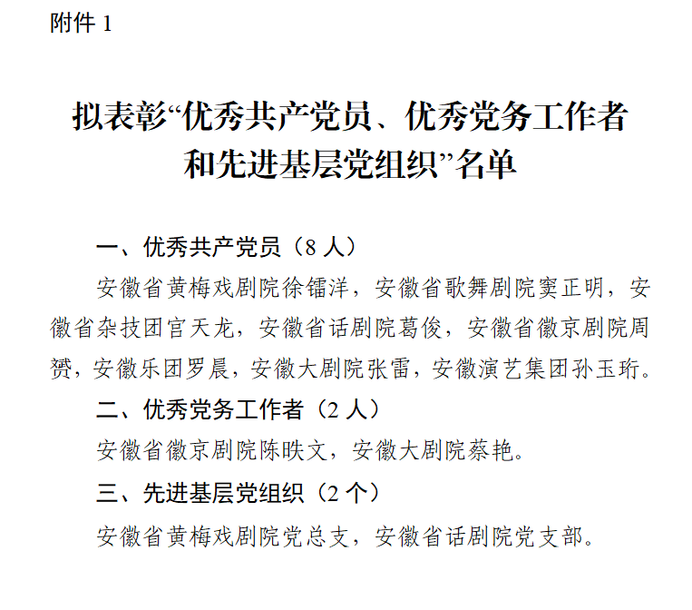 根據(jù)集團(tuán)黨委《關(guān)于開展“優(yōu)秀共產(chǎn)黨員、優(yōu)秀黨務(wù)工作者和先進(jìn)基層黨組織”評(píng)選活動(dòng)的通知》《關(guān)于開展“四強(qiáng)”黨支部評(píng)定、“四好”黨員選樹工作的方案》要求,經(jīng)各基層黨組織推薦申報(bào)、黨委會(huì)議研究決定,擬表彰徐鐳洋等8名同志為“優(yōu)秀共產(chǎn)黨員”,陳昳文等2名同志為“優(yōu)秀黨務(wù)工作者”,安徽省黃梅戲劇院黨總支等2個(gè)黨組織為“先進(jìn)基層黨組織”,安徽省黃梅戲劇院第二黨支部等4個(gè)黨支部為“四強(qiáng)”黨支部,姚恩田等16名同志為“四好”黨員?,F(xiàn)予以公示(具體名單附后)。