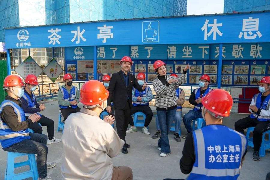 11月2日下午,在中鐵上海局三公司創(chuàng)智天地項(xiàng)目部工地,黨的二十大代表、國家一級(jí)演員,新一代黃梅戲藝術(shù)傳承人,安徽省黃梅戲劇院的袁媛在為工人們表演經(jīng)典的黃梅戲片段。