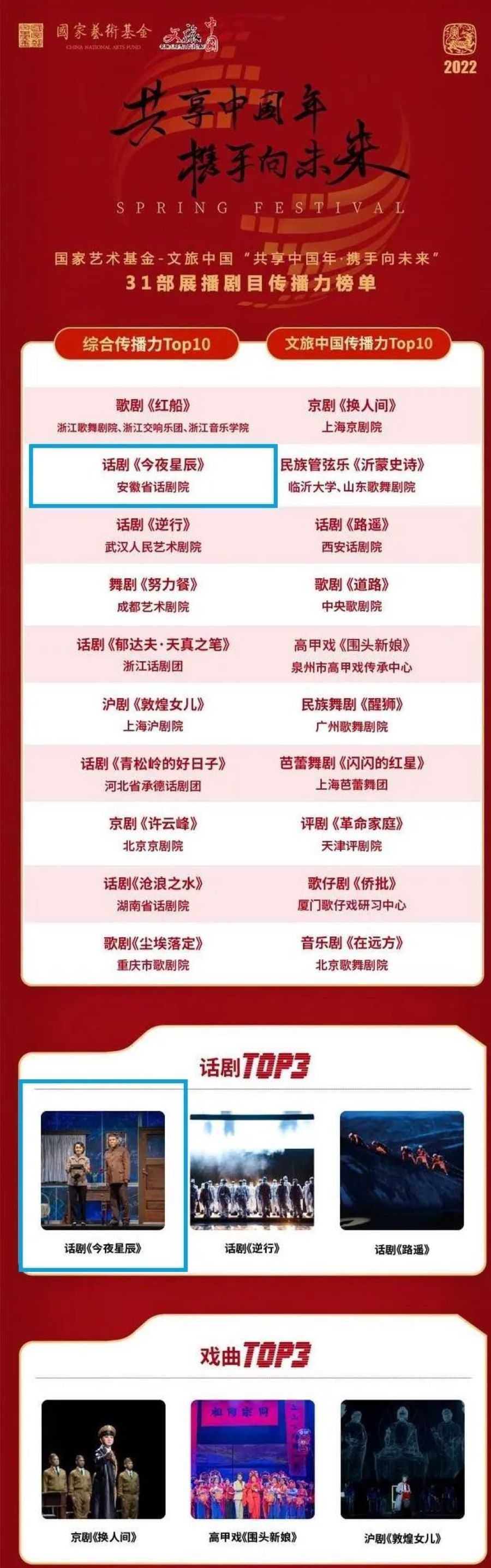 近日,國家藝術(shù)基金——文旅中國31部春節(jié)展播劇目傳播力榜單揭曉,由安徽省話劇院創(chuàng)排的話劇《今夜星辰》榮獲本次活動傳播力榜單綜合榜第二、話劇類榜首。