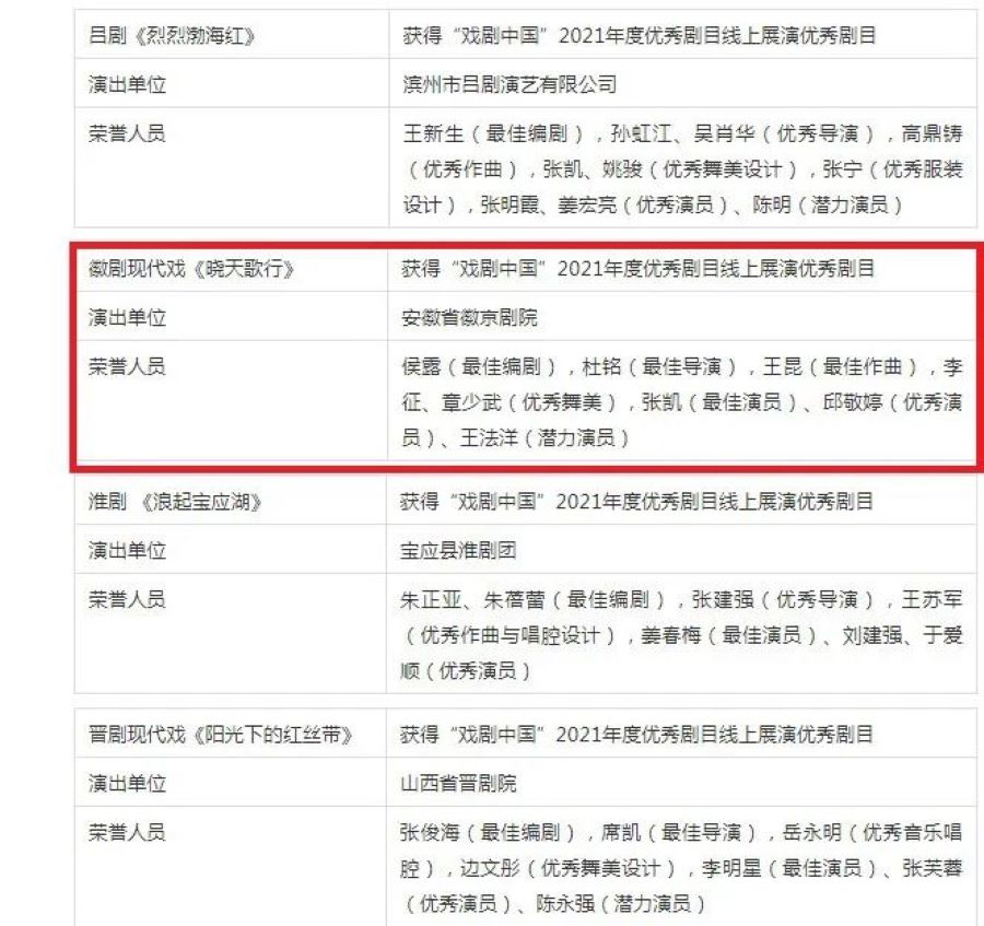 近日,戲劇中國(guó)”2021年度優(yōu)秀劇目線上展演推選結(jié)果公布,由安徽省徽京劇院創(chuàng)排的徽劇現(xiàn)代戲《曉天歌行》榮獲“戲劇中國(guó)”2021年度線上展演優(yōu)秀劇目。