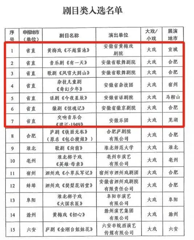 近日,由中共安徽省委宣傳部、安徽省文化和旅游廳、安徽省文學(xué)藝術(shù)界聯(lián)合會共同主辦的安徽省優(yōu)秀舞臺藝術(shù)作品下基層演出活動公布了入選名單,集團(tuán)7部劇目、4個節(jié)目成功入選(見入選名單)。其中,黃梅戲《不越雷池》、雜技兒童劇《奇幻少年》、話劇《今夜星辰》、交響音樂會《渡江·1949》將分別赴宣城、宿州、馬鞍山、蕪湖演出。